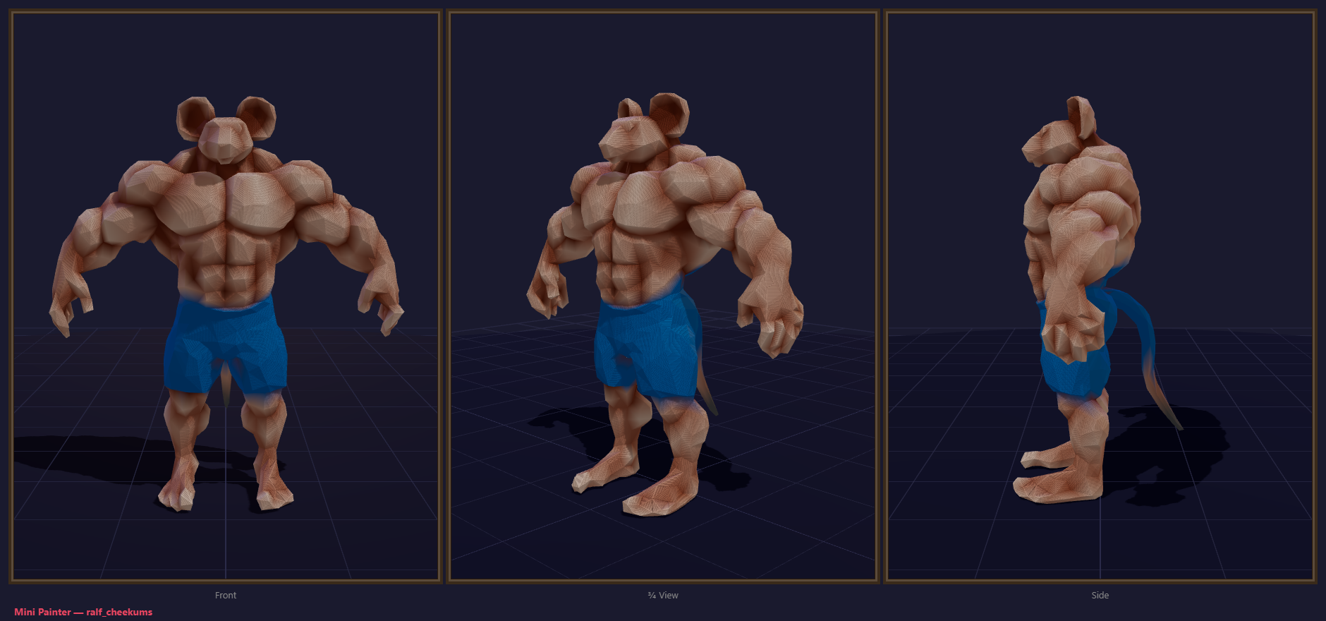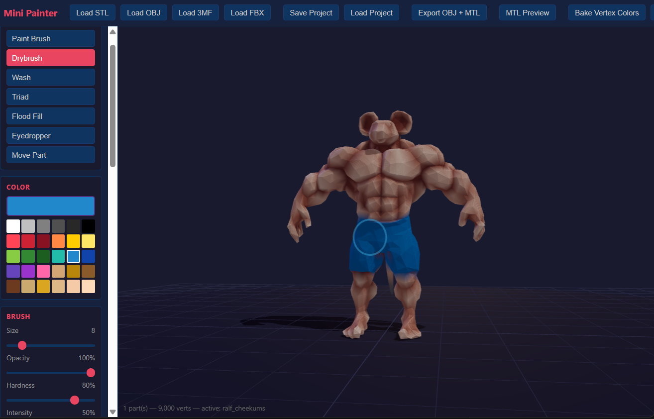 Mini Paint Oh is a free, browser-based 3D miniature painting simulator. Load your own models and paint them right in the browser — no installs, no accounts, no server required.